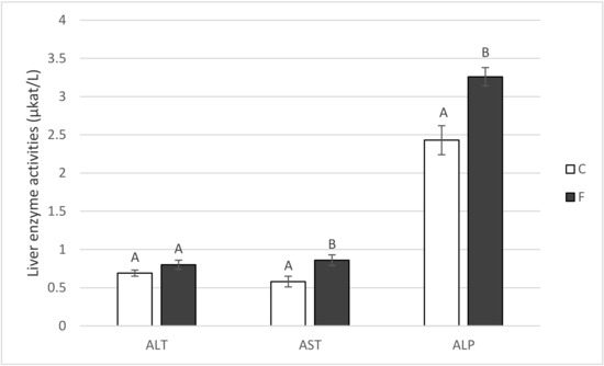 Activities of the liver enzymes alanine transaminase (ALT), aspartate transaminase (AST) and alkaline phosphatase (ALP) of pigs fed for four weeks on either the control standard feed mixture (C) or feed mixture enriched with 8% fish oil (F). Means with different letters within the given parameter differ at p < 0.05 (Mann–Whitney U test; n = 6).