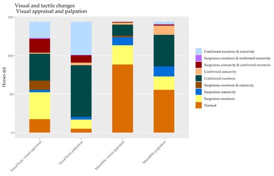 Palpation appears to be more sensitive to changes on both of these sites than visual appraisal, resulting in more findings of exostosis. Palpation confirmed exostosis in at least 45% of the nasal bones and 27% of the mandibles. Palpation confirmed concavity in at least 2.1% of the nasal bones and 8% of the mandibles. The proportion of horses assessed to be at least suspicious for both sorts of change was at least 36% but again depended on the examiner.