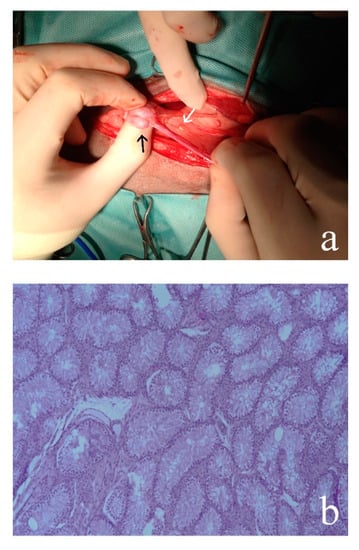 (a) Gonadectomy of Case 2 in which atrophic testis (black arrow) with uterine horn (white arrow) are showed; (b) histology of the atrophic testes in which is evident the structure of the tubules covered by Sertoli cells and without germ lines (20×) (see also supplementary Figure S1 for comparison). Hematoxylin–eosin (HE) staining.