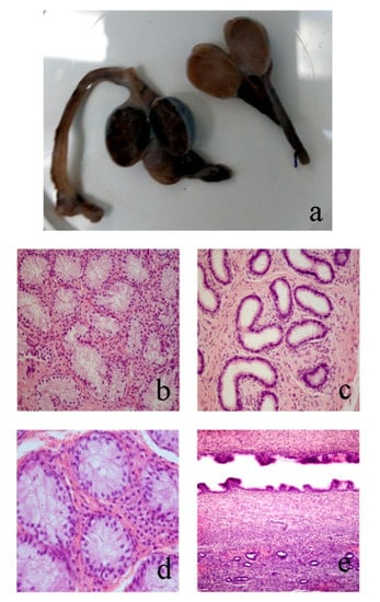 The inguinally cryptorchid gonad had an ovoid shape and was connected to a tubular structure. One of the structures was referable to testis and the other to epididymis. The abdominally located gonad was smaller than the inguinal one and connected to a tubular structure which was similar to a hypoplastic uterine horn. Both gonads exhibited a testicular structure (Figure 3a), characterized by seminiferous tubules lined by Sertoli cells without germ cells. Interstitial tissue was abundant and many Leydig cells were present (Figure 3b). The epididymis was present in either gonad and showed empty tubules lined with columnar epithelium (Figure 3c). The abdominally located gonad showed a strong hematic component diffused in the interstitial tissue (Figure 3d). The tubular structure expressed features similar to a uterus with a lumen lined by simple columnar epithelium with an undulating pattern forming short papillae. Underneath the epithelium, a dense interstitial layer surrounded the glandular structures (Figure 3e).