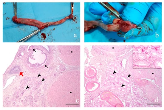 Genital apparatus surgically removed in Case 4. (a) A well-developed uterus and (b) section of gonads; (c) ovarian tissue composed of numerous follicles in various stages of development (black arrows), rare atretic follicles (red arrow) associated with few corpora lutea (asterisks) and, more deeply located, curvy seminiferous tubules (arrowhead), supported by abundant ovarian stroma; (d) testicular tissue composed of curvy seminiferous tubules (arrowhead) associated with two corpora lutea (asterisk) supported by a moderate amount of dense fibrous stroma with medium- and large-sized blood vessels. Insert: seminiferous tubules are lined by one layer of Sertoli cells extending from the basement membrane and protruding into the lumen and diffusely lack germ cells (hypoplasia). Interlaced with seminiferous tubules there are rare groups of Leydig cells. Hematoxylin–eosin (HE) staining. Scale bars = 500 μm.