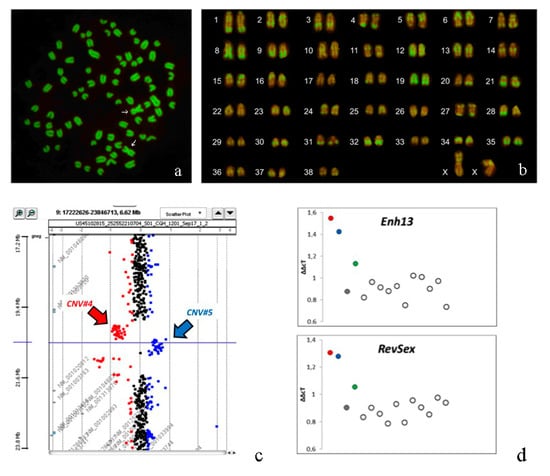 (a) Metaphase plate with 2n = 78; XX of Case 3 (arrows indicate X chromosomes); (b) R-banding (RBA) karyotype of Case 3; (c) CGH-array profile regarding copy number variation (CNV) number 5 and 4 identified in Case 1 (Case 2 and 4 show the same CNV profile). The points above indicate the number of copies of the region tested. Black: region present in two copies; red region with fewer copies than normal (deletion); blue: region with more copies than normal (duplication). The x axis indicates the genomic position on chromosome 9 of the probes analyzed. The x-axis indicates the log ratio identified after the CGH analysis; (d) qPCR results for RevSex and Enh13 regions in the 4 cases and 11 controls. The dots show the comparative CT method (ΔΔcT) values obtained in the 11 control dogs and for the 4 DSD dogs (Case 1: red; Case 2: blue; Case 3: grey and Case 4: green).