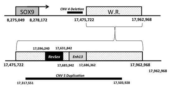 From a genetic point of view, the most interesting result concerns the identification of a CNV involving the SOX9 gene in three subjects, the CNV number 5 reported in Table 3. This CNV is identified as a duplication involving 458 Kb comprising the genomic region between base 17,503,928 and base 17,962,221 of chromosome 9 (CanFam3 genome assembly, Table 3 and Figure 5c). Apparently, this CNV is present in 3′ to the SOX9 gene (chr9: 8,275,049–8,278,172) and therefore it is unlikely that it will affect the regulation of this gene. However, it has recently been shown that the assembly reported in CanFam 3.1 of this particular chromosomal region is incorrect as shown by Rossi et al. []. In this work, it is shown that the chr9: 17,475,722–17,962,968 genomic region, reported in the assembly in 5 ‘to the sox9 gene, is probably positioned in 5′ to the SOX9 gene and that it contains both the RevSex region (chr9: 17,686,362–17,685,942) and the Enh13 region (chr9: 17,596,240–17,631,842; Figure 6). Therefore the duplication identified in subjects 1, 2 and 4 would include both these regions probably positioned in the promoter region of the Sox9 gene. This duplication was confirmed by qPCR analyses in subjects 1, 2 and 4 (Figure 5d). This result is very interesting, considering that duplication of one of these genomic regions can lead to XX SR in humans. It is not the first time that this genomic region has been involved in CNV: it had previously been identified as a deletion by Chen et al. [] and by Mortlock et al. []. Nevertheless this CNV had already been described as a deletion and never as a duplication.