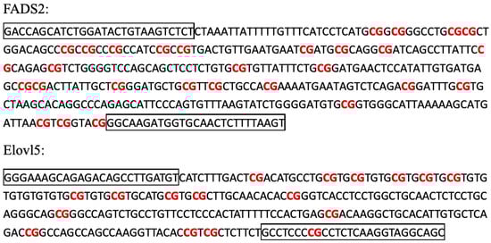 DNA was extracted from the liver samples of the experimental fish. Sodium bisulfate modifications were performed with the EZ DNA Methylation-Gold Kit D5005 (Zymo Research, Irvine, CA, USA), following the manufacturer’s instructions. After bisulfite conversion, the core regions of the FADS2 and Elovl5 gene promoters (Figure 1) were PCR amplified using primers specific to the FADS2 or Elovl5 gene sequence (Table 2). The FADS2 promoter sequence has been previously published []. PCRs were performed in 50 μL volumes, each containing 2 µL bisulfate-modified DNA, 0.5 μL Taq polymerase, 2 μL primers, 2 μL dNTP and 5 μL Taq Buffer (with MgCl2). The mixture was preheated at 95 °C for 5 min, then subjected to 35 cycles of amplification (95 °C for 30 s, 58 °C for 30 s and 72 °C for 30 s). The purified PCR products were cloned into pMD18-T vectors (TaKaRa Biotechnology), and 10 clones from each sample were randomly selected for Sanger sequencing.