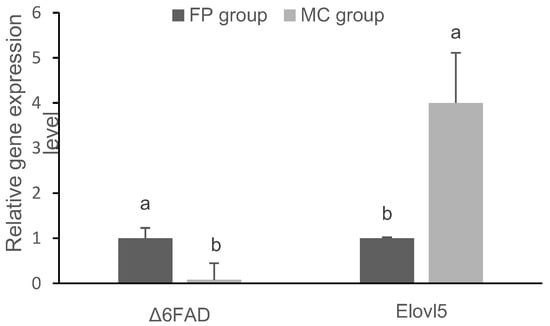 We identified a significant difference in the abundances of FADS2 and Elovl5 transcripts between the two groups (Figure 2). Elovl5 transcripts in the MC group were significantly more abundant than in the FP group (p < 0.05). In contrast, FADS2 gene expression was significantly lower in the MC group as compared the FP group (p < 0.05).
