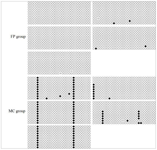 The FADS2 promoter sequence has been previously published []. Two CpG islands were identified around the transcriptional start site, but only one had a significantly different rate of methylation between the two groups. Two CpG loci in this region were heavily methylated in the MC group, but were only slightly methylated in the FP group (Figure 3). The CpG methylation rate was significantly negatively correlated with the mRNA expression of FADS2 (r = −1).