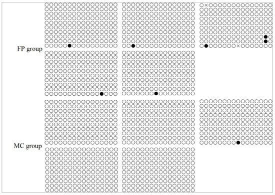 We cloned a 1348-bp fragment upstream of the Elovl5 translation start codon. Only one CpG island was identified between −372-bp and −229-bp upstream of the transcription initiation site. There were no significant differences in the methylation states of the 16 CpG sites in the Elovl5 gene promoter between the FP group and the MC group (Figure 4).