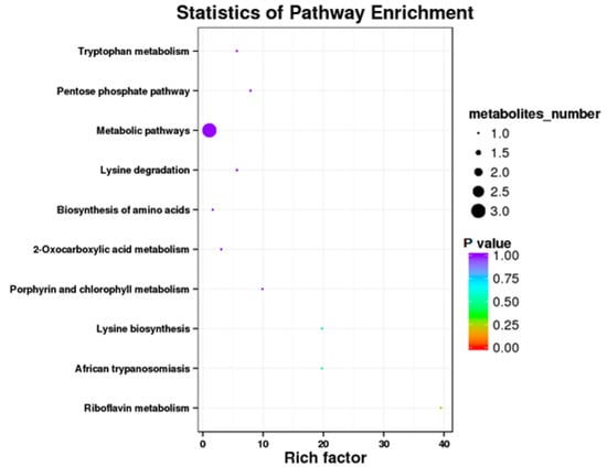 The results showed that some metabolic pathways in the SP2 group changed significantly as compared with the SP1. Figure 1 and Table 9 shows that 31 metabolites up-regulated, 15 down-regulated, and 2264 had no effect on the processes. The KEGG pathways, including the metabolic pathway, tryptophan metabolism, pentose phosphate pathway, lysine degradation, biosynthesis of amino acids, 2 oxocarboxylic acid metabolism, porphyrin and chlorophyll metabolism, lysine biosynthesis, African trypanosomiasis, and riboflavin metabolism, were found to be the top 10 annotated pathways for the SP2 (Figure 2).