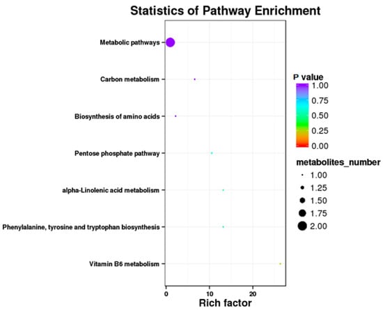 Results showed that some metabolic pathways in the RPC group changed significantly as compared with the RP. Figure 3 and Table 10 show that 24 metabolites up-regulated, 35 down-regulated, and 2251 had no effect on the processes. The KEGG pathways, including the metabolic pathway, carbon metabolism, biosynthesis of amino acids, pentose phosphate pathway, alpha lenolenic acid metabolism, phenlyalanine tyrosine and tryptophan biosynthesis, and vitamin B6 metabolism were found to be the annotated pathways for the RPC (Figure 4).