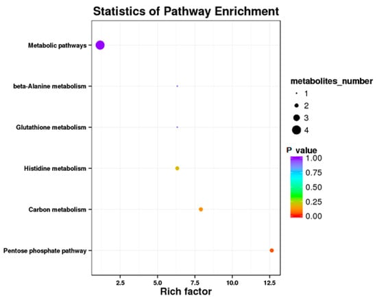 Results showed that some metabolic pathways in the RPGC group changed significantly as compared with the RP. Figure 5 and Table 11 shows that 18 metabolites up-regulated, 16 down-regulated, and 2276 had no effect on the processes. The KEGG pathways, including the metabolic pathway, beta alanine metabolism, glutathione metabolism, histidine metabolism, carbon metabolism, and pentose phosphate pathway were found to be the annotated pathways for the RPGC (Figure 6).