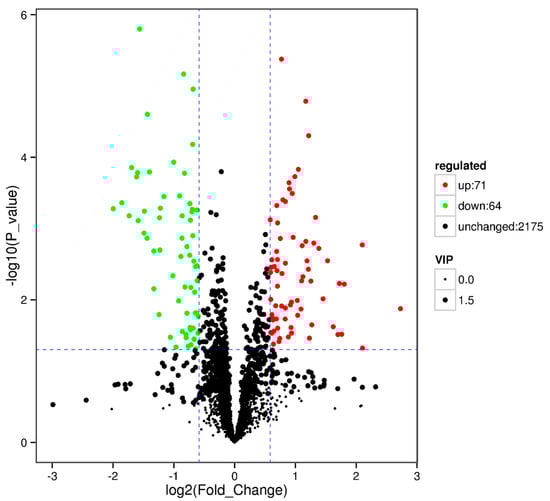 Volcano plot showing metabolomics data of SP2. The horizontal axis indicates the large magnitude fold-changes and the vertical axis indicates the high statistical significance (−log10 of p value). The dashed line shows where p = 0.05 with points above the line having p < 0.05 and points below the line having p > 0.05. Each point represents a metabolite, and the point size represents the VIP (variable importance in projection) value.