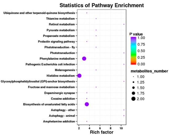 Results showed that some metabolic pathways in the RPGC group changed significantly as compared with the SP2. Figure 7 and Table 12 shows that 71 metabolites up-regulated, 64 down-regulated, and 2175 unchanged the processes. The KEGG pathways, ubiquinone and other terpenoid quinone biosynthesis, thiamine metabolism, thiamine metabolism, retinol metabolism, pyruvate metabolism, propanoate metabolism, prolactin signaling pathway, phototransduction fly, phototransduction, phenylalanine metabolism, pathogenetic escherichia coli infection, melanogenesis, histidine metabolism, glycolsylphosphatidylinositol (GPI) anchor biosynthesis, fructose and mannose metabolism, dopaminergic synapse, cocaine addiction, biosynthesis of unsaturated fatty acids, autophagy other, autophagy animal, and amphetamine addiction were found to be the annotated pathways for the RPGC (Figure 8).