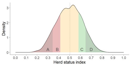 Distribution of the composite herd status index (HSI) across 4321 dairy herds for herds in the bottom 10% (A), bottom 25% (B), median (vertical line), top 25% (C), and top 10% (D), with a small HSI value suggesting a low overall herd status.