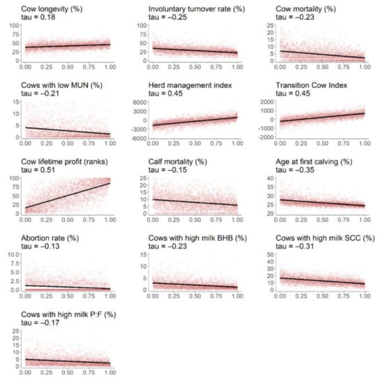 The strength of association between the individual indicators and HSI differed (Figure 2). Associations with the HSI were strongest for production-related indicators such as cow lifetime profit, herd management index, and transition cow index (Kendall’s tau ≥ 0.45). The HSI was most weakly associated with calf mortality and abortion rate, presumably due their low prevalence and skewed distribution. Additional information, if available, on calf mortality at later calf development stages [] might strengthen the association with HSI. Moreover, converting absolute values to a relative change (e.g., the relative change in calf mortality over consecutive years) might circumvent the issue of low prevalence and heavily skewed distributions. Although the aim of the present study was not to assess direct associations with welfare and health, previous studies reviewed elsewhere [] have shown that routine herd data relating to milk yield, culling, and reproduction were well associated with important aspects of herd welfare such as lameness, body lesions, and cleanliness.