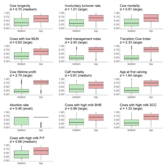 Our results suggest that herds with a low and high status can be well distinguished, with most indicators having a distinct effect on the observed difference between herds in the top 25% and bottom 25% (Figure 3). The effect size was largest for production-related indicators (cow lifetime profit, herd management index, and transition cow index), in line with results from Figure 2. A medium effect was observed for cow longevity, calf mortality, and percentage of cows with a high milk protein-to-fat ratio, whereas only a small effect was observed for abortion rate, which is consistent with their overall low prevalence observed in the present study.