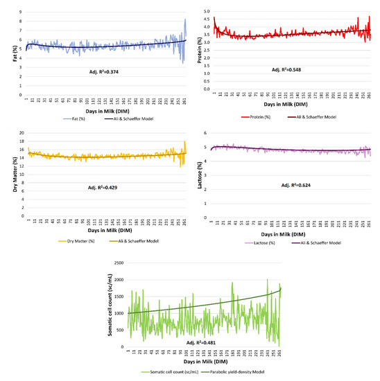 Tables S5–S7 show summaries of the adjusted coefficients of determination (Adj. R2), percentages of successfully fitted curves, and Adj. R2 standard deviations of the models for milk protein, fat, dry matter, lactose (%), and somatic cell counts (sc/mL) curve fitting in Murciano-Granadina goats. The adjusted R2 for the model reporting the best ability to capture variability was 0.548, 0.374, 0.429, and 0.624 for protein, fat, dry matter, and lactose content, respectively, for the model of Ali and Schaeffer (ALISCH), while the parabolic yield-density (PARYLDENS) model reported the highest values for Adj. R2 for somatic cell counts (0.481) (Figure 1).