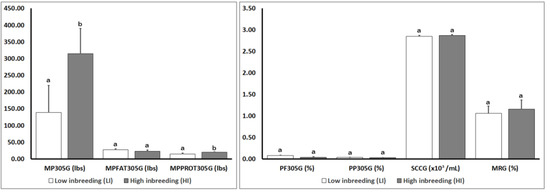 Effect of the degree of inbreeding (LI versus HI) on the genomic parameters for production traits in high-producing primiparous dairy cows. Production genomic values: MP305G: Milk Production at 305 days; MPFAT305G: Fat Production at 305 days; MPPROT305G: Protein Production at 305 days; PF305G: Percent of Fat at 305 days; PP305G: Percent of Protein at 305 days; SCCG: Somatic Cell Count; MRG: Mastitis Resistance. Different letters show statistical differences between values (p ≤ 0.05). lbs: Pounds; %: Percentage; SEM: Standard Error of the Mean.