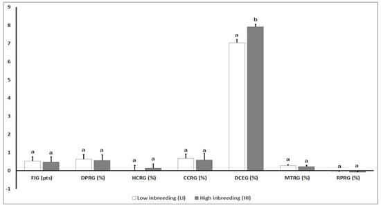 Effect of the degree of inbreeding (LI versus HI) on genomic parameters for reproductive traits in high-producing primiparous dairy cows. Reproductive genomic values: FIG: Fertility Index; DPRG: Daughter Conception Rate; HCRG: Nulliparous Cow Conception Rate; CCRG: Cow Conception Rate; DCEG: Daughter Calving Ease; MTRG: Resistance to Metritis; RPRG: Resistance to Placental Retention; NS: Not Significant; SEM = Standard Error of the Mean. Different letters show statistical differences between values (p ≤ 0.05). pts: points; %: Percentage; SEM: Standard Error of the Mean.