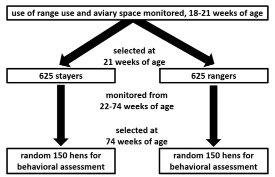 This experiment was a part of larger experiment using 5 flocks of 40,000 Lohmann Brown hens each where 3125 hens/flock were monitored for their aviary and range use during their life in the hen house from 16 to 74 weeks of age []. Thus, hens experienced access to the range during all seasons. The indoor stocking density was 9 hens/m2 and outdoor stocking density was 1500 hens/ha in all the flocks. Hen monitoring was conducted using Radio Frequency Identification (RFID) leg bands (Monza R6 UHF RFID Tags, Impinj, Seattle, WA, USA) and custom-built RFID antennae []. The shed interior of all sheds was equipped with two three-tier aviary system using chain-feeders and perches, with nest boxes being placed in the middle tier (Natura Step, Big Dutchman, MI, USA). Hen movement in this system was monitored (from 4 am to 8 pm) by placing RFID antennae 30 cm apart along the right and left side of the feeder line at the top tier (referred to as “upper feeder tier”) and bottom tier (referred to as “lower feeder tier”), as well as placing one RFID antenna at the entrance of the nest box, located on the middle tier. Further details regarding the monitoring system can be found in Sibanda et al. (2020) []. All experimental hens were individually weighed before range access was first provided at 16 weeks of age and weighed again at 21 weeks of age (Veit BAT 1, Moravany, Czech Republic). From the age of 21 weeks onwards, the experimental hens were partitioned according to their range use into groups consisting of “stayers” (hens that preferred to stay in the shed on most days) or “rangers” (hens that accessed the range on most days) and continued to be monitored for their range and aviary use until 74 weeks of age. All hens had equal access to all resources (the aviary system, both feeders, drinkers, nest boxes, and the range) but could not leave their partition (e.g., stayers or rangers) due to the trans-sectional divisions in the hen house and the 1.8–1.2 m high fence that separated the ranges. Equal numbers of stayers (n = 625) and rangers (n = 625) were placed in each partition, allowing for a comparable stocking density. Figure 1 outlines the study population: Hens were allowed an acclimatization period of 2 weeks to the range (16–18 weeks of age), subsequently all hens were monitored for their range and aviary use between 18 and 21 weeks of age. All three flocks had the same arrangement inside the shed as well as structure and orientation of the shed and were carried out in parallel in different sheds (few weeks apart to allow ease of sampling).