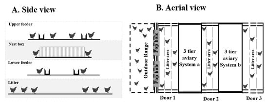 - Sibanda, T.Z.; Walkden-Brown, S.W.; Kolakshyapati, M.; Dawson, B.; Schneider, D.; Welch, M.; Iqbal, Z.; Cohen-Barnhouse, A.; Morgan, N.K.; Boshoff, J.; et al. Flock use of the range is associated with the use of different components of a multi-tier aviary system in commercial free-range laying hens. Br. Poult. Sci. 2020, 61, 97–106. [Google Scholar] [CrossRef] [PubMed]