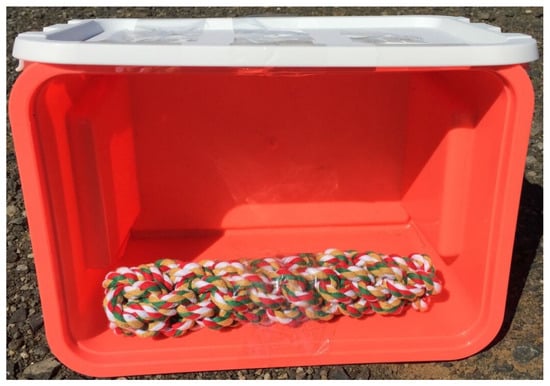 For the NA test, hens were placed in the center of the arena, facing away from the researcher, and then left for 8 min with the door of the arena closed []. Immediately thereafter, the NO test was conducted where a novel object (dog play rope of mixed color 20 cm in length, taped to a neon-pink plastic colored box 26.7 × 18.3 cm; Figure 3) was introduced within 3 s through a small trap door (20 × 26.5 cm) on the back wall of the arena, minimizing human contact []. The NO was left with the hen in the arena for 5 min. After the completion of the NO test, the number of defecations were counted and removed from the bedding material. Each hen was then weighed using poultry weighing scales (Veit BAT 1, Moravany, Czech Republic) and returned to the flock.