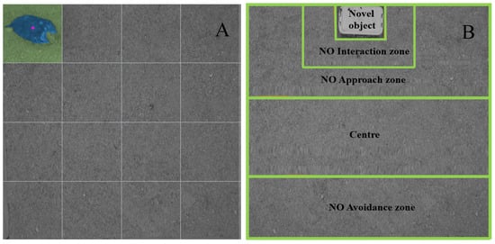Layout of novel arena (NA) test from the ANYmaze software that was used to determine different parameters of NA test in the laying hens of a commercial farm. The novel arena was 1.7 m2 and the lines were virtually overlaid on the video footage using the ANYmaze software to divide the NA into 16 equal squares. (A) shows the tracking of the hens by ANYmaze software to determine the number of lines crossed and the total distance moved/hen in the NA. (B) Layout of novel object (NO) test from the ANYmaze software that was used to determine different parameters of NO test. The lines were virtually overlaid on the video footage using the ANYmaze software to divide the NA into four zones of interest; NO avoidance zone, Centre, NO approach zone and NO interaction zone. Automatic tracking at different zones was done using the software after placing the NO from the trap door. The bright green line across the figure is the virtual scale from the software overlaid on the video used for measurement and dividing the arena into zones. Time spent at these zones and total distance moved were some of the measured parameters.