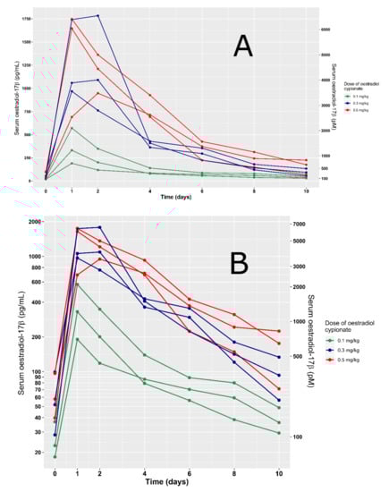 In our study, the pre-drug serum concentrations of estradiol-17β ranged from 18.2 to 96.7 pg/mL (mean = 50.2 pg/mL, 95% CI = 27.2–73.2 pg/mL). These concentrations are similar to those reported in investigations of domestic cats. In one study, the mean peak and trough plasma concentrations of endogenous estradiol-17β during polyestrous in four naturally cycling female cats were 59.5 pg/mL and 8.1 pg/mL, respectively [43]. In a separate study, the peak plasma concentrations of estradiol-17β in domestic cats were 50–70 pg/mL [42].