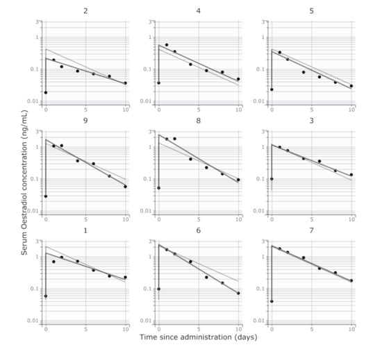 Individual goodness-of-fit plots for the estradiol-17β concentrations after intramuscular administration of estradiol cypionate. Subjects 2, 4, and 5: nominal dose 0.1 mg/kg (of estradiol cypionate); subjects 9, 8, and 3: nominal dose 0.3 mg/kg; subjects 1, 6, and 7: nominal dose 0.5 mg/kg. Points are the individual observations. Solid lines are the individual predictions. Dashed (light grey) lines are the population predictions (fixed effects only).