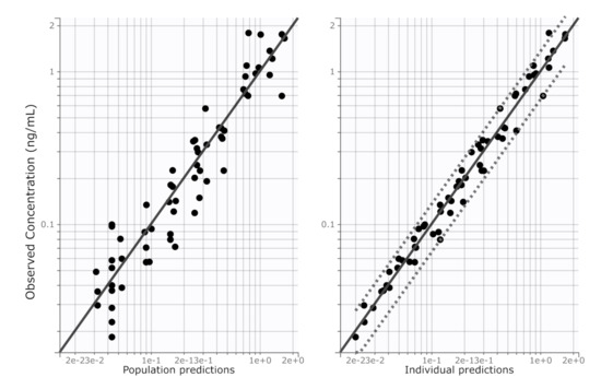 The statistical model specified log-normal distributions of the parameters, and a proportional error model. As all parameters are therefore positively valued, in this model, the absorption rate constant must be smaller than the elimination rate constant (Equation (3); [41]). A random effect (between-subject variability) was not estimated for the volume of distribution, as initial analysis suggested that the data were not sufficient to support this.