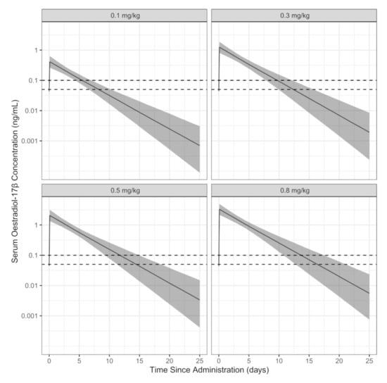 Two estimates of a supraphysiological serum concentration of estradiol-17β were chosen for simulations: 0.1 ng/mL and 0.05 ng/mL. These estimates were based on the natural cycles of estradiol-17β in domestic cats [42,43]. To determine the predicted time at which the proposed threshold concentrations of interest would be reached, simulations were conducted from the final pharmaco-statistical model. Simulations of 2000 subjects (for each dose) were performed using the ‘Simulx’ package in R (version R-3.6.3) [44]. A range of doses, including and above the studied doses, was examined, and the time for which 10%, 50%, and 90% of simulated subjects exceeded the target concentrations was determined. The prediction intervals were obtained across the simulated time series, and interpolating splines used to determine the time-to-reach-target.