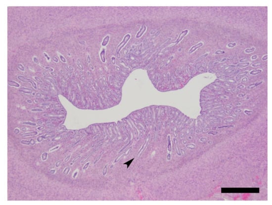 Feline uterine horn. The endometrium demonstrates elongated long glands (arrowhead), which are characteristic of the luteal stage. H&E stain. Bar = 500 µm.