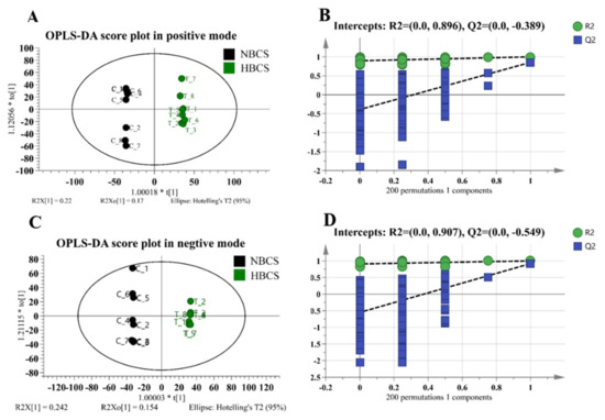 The OPLS-DA model was performed to distinguish the overall differences in metabolic profiles and to find differential metabolites between the two groups. Samples of NBCS and HBCS groups could be separated clearly without any overlap in OPLS-DA score plots under the positive and negative mode condition (Figure 1A,C). In positive iron mode, the OPLS-DA model produced one predictive component and two orthogonal components. In addition, the cumulative explained variation of R2X (cum) and R2Y (cum), and estimate of model predictive ability (Q2 (cum)) were 0.486, 0.999, and 0.855, respectively. Moreover, the OPLS-DA model for two groups resulted in one predictive component and three orthogonal components with R2X (cum) = 0.611, R2Y (cum) = 0.999, and Q2 (cum) = 0.917 in negative iron mode. The intercepts of Q2 in two iron modes were −0.389 and −0.549, and both were less than 0.05, indicating an absence of overfitting (Figure 1B,D).