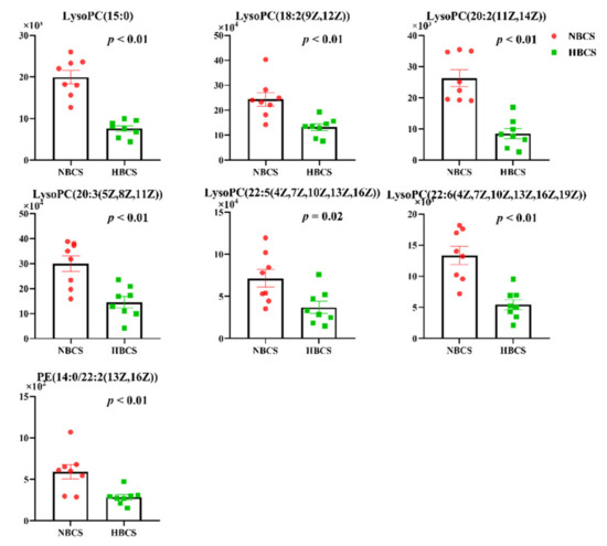Based on the results of LC-MS, a total of 23 differential metabolites for distinguishing NBCS from those of HBCS group with VIP >1.0 and p < 0.05 are presented in Table S1. Among these metabolites, seven important metabolites identified included six distinct lysophosphatidylcholines [LysoPC(15:0), LysoPC(18:2(9Z,12Z))), LysoPC(20:2(11Z,14Z)), LysoPC(20:3(5Z,8Z,11Z)), LysoPC(22:5(4Z,7Z,10Z,13Z,16Z)) and LysoPC(22:6(4Z,7Z,10Z,13Z,16Z,19Z))], as well as a phosphatidylethanolamine (PE(14:0/22:2(13Z,16Z))). Furthermore, the concentrations of the seven metabolites were decreased in the HBCS group compared with NBCS group (Figure 2).