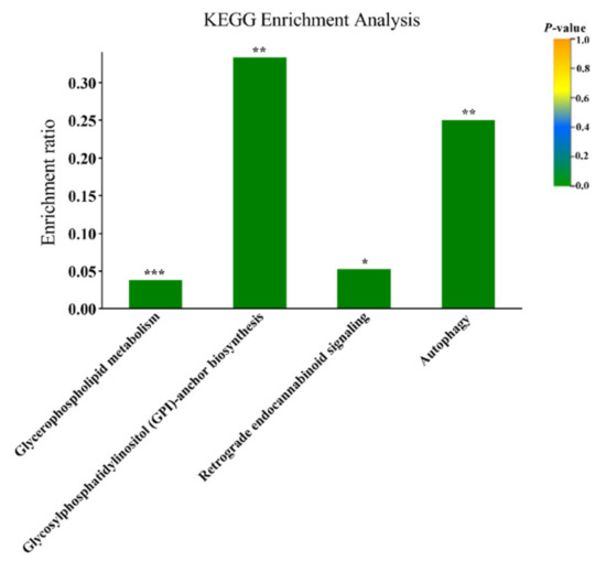 Based on the KEGG pathway analysis, they were significantly enriched in four pathways in accordance with a corrected p value by the Benjamini and Hochberg method (p < 0.05): glycerophospholipid metabolism, retrograde endocannabinoid signaling, autophagy, and glycosylphosphatidylinositol (GPI)-anchor biosynthesis (Figure 3).
