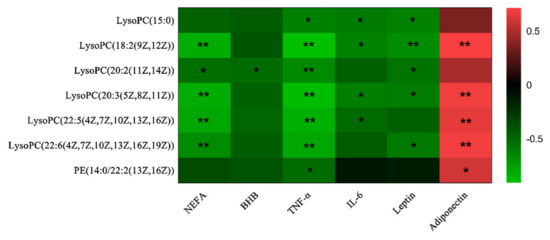 As important signaling molecules, LysoPCs have diverse biological functions on cellular signaling processes, apoptosis induction, and anti-infective effects, especially on the inflammation process [27,28]. At present, the evidence is emerging to indicate that LysoPCs serve as important mediators in inflammatory diseases [28]. In this study, there was a negative correlation between LysoPCs and proinflammatory cytokines (TNF-α and IL-6), similar to the results of Heimerl et al. [7], who reported that LysoPCs correlated significantly with a proinflammatory indicator (e.g., C-reactive protein), and the decreased concentration of LysoPC was associated with its protective and anti-inflammatory effects. Thus, given fat cows being in serious proinflammatory conditions, it is reasonable to speculate that alterations of LysoPCs profile may be related to the role of LysoPCs in neutralizing the inflammation. Additionally, it was reported that LysoPCs may regulate inflammation through their fatty acyl chain [29]. For example, the unsaturated LysoPCs (20:4 and 22:6) could counteract proinflammatory effects [13,30]. Whereas saturated LysoPC (16:0), acting as an inflammatory inducer, could promote proinflammatory cytokine activity, cause migration of immune cells, and cause plasma leakage [30]. However, the reason for the decrease in saturated LysoPC(15:0) in HBCS requires further study.