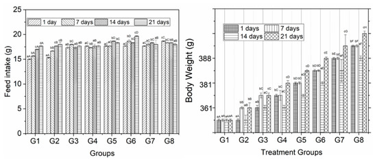 The results of body weight are presented in Figure 1 that showed significant results in groups and study duration from 0 to 21 days. The maximum values (396.25 g) were observed in group 8. The minimum values (305 g) were observed in group 1 and group 2. However, regarding comparison within an experimental period, weight gain increments were high at 7 and 21 days. The gain in weight was more in 2 and 4 weeks, whereas, from week 1 to 3, the weight gain was less for both control and experimental diets. Among the difference between the weekly weights, the control diet albino rats gained more weight when compared with experimental diet albino rats except in weeks 2 and 3.