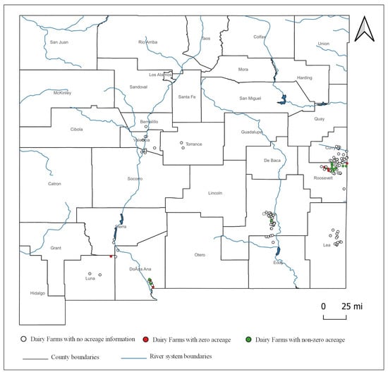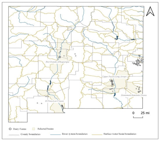Dryland regions occupy over forty percent of the land surface area and more than 2 billion people reside in these regions [10]. Up to 44% of the world’s cultivated area lie there and significantly contribute towards global food production [10]. The state of New Mexico in the United States (US), with its arid and semiarid climate and a significant intensification of dairy industry in the past few decades, stands out as a perfect candidate for the study of this trend. Although New Mexico ranks ninth in the US for the total number of milk cows, it has the largest herd size of 3187 cows and has held this position since 2002 [11,12]. The state had approximately 80,000 cows on 105 farms in the early 1990, which increased to 180 dairies with 325,000 dairy cows by 2007 and to 140 dairies with 326,000 dairy cows in 2019 [13]. Most of the large dairy farms in the state are concentrated in the state’s south and east—Chaves, Curry, Roosevelt, Doña Ana, and Lea counties—accommodating over 90% of the state’s cows [12]. The number of milk cows has recently increased by 6% from 2012 to 2017, but the number of dairy operations declined by 5%, which points toward a trend of dairy farm consolidation. Large dairy farms with 500 or more cows now account for more than 99% of the statewide inventory and occupy a comparable share of the dairy products market [12]. The dairy industry, including production, processing and export of the dairy products, is a major revenue source and employment generator for the state, but this growth comes at a cost of damages to public health and the environment [14].