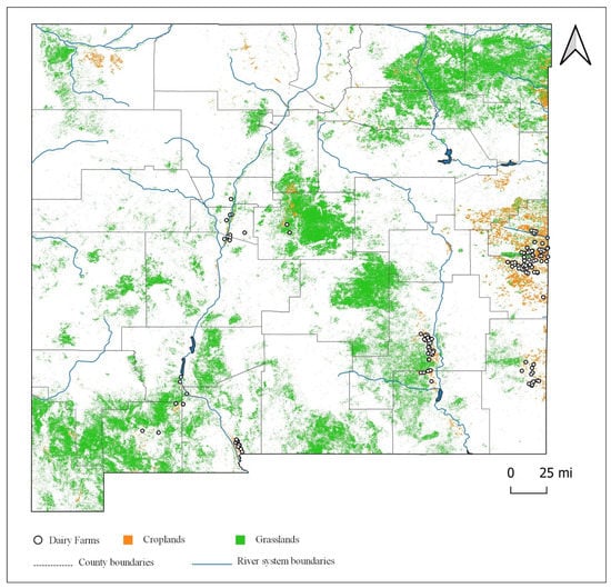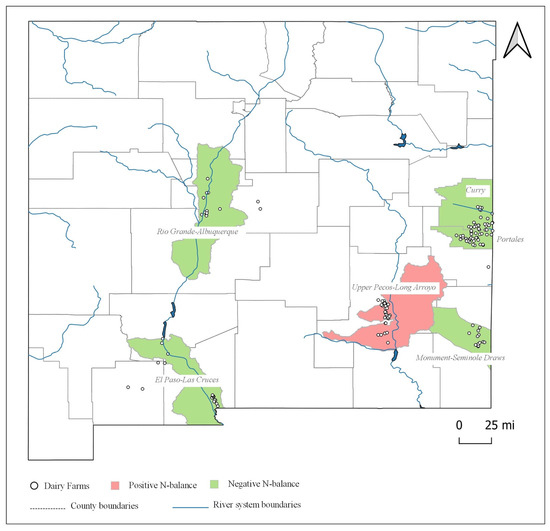 To identify the acreage of cropland suitable for applying manure at the county and watershed level, we selected 12 distinct field crops and 5 double crops. Field crops such as corn, oats, wheat, hay, barley, and sorghum are recognized as significant manure recipient crops [4]. Fruit and vegetable crops do not generally receive manure due to the concerns of pathogen contamination. The field crops used in our N-balance assessment were winter wheat, alfalfa, sorghum, corn, hay, triticale, double-crop winter wheat/corn, double-crop winter wheat/sorghum, millet, oats, double-crop barley/corn, double-crop triticale/corn, barley, rye, spring wheat, durum wheat, and double-crop oats/corn in the descending order of their acreages. Acreage data for all three types of wheat (winter, spring, and durum wheat) were merged for calculating the acreage of wheat. The LULC data were also used to estimate the acreages of different crops on each dairy farm, as the dairy farm data from the New Mexico Environment Department do not include information on the types of crops grown in the onsite croplands. Calculating the farm-level acreages of each crop using the same approach as at the county or watershed level was prone to errors due to two main reasons. First, the spatial resolution of the LULC data is 30 m, which is comparable in dimension to the cropland acreages of dairy farms. Therefore, there is a high chance of misattribution and underestimation. Second, without identifying the actual plots of croplands, the only viable option is to draw a circle around the farm based on acreage data. However, the geographic coordinates of the farm are not necessarily in the geographic center of the farm. Therefore, spatial analysis using circles drawn around the farm might be unrepresentative of the onsite cropland. To circumvent these limitations, we used the proportions of crop acreages for three major crops at the watershed level to calculate the N utilization potential of the onsite croplands with non-zero acreage. We also performed an alternative assessment to see if using crops with the highest N requirement (e.g., what if corn is the only crop grown) would change the results.