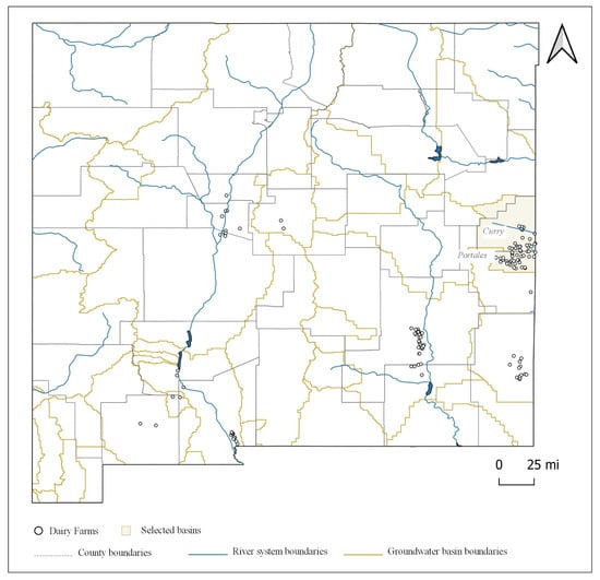 Figure 3 displays the surface water basins in New Mexico and Figure 4 displays the groundwater basins in New Mexico. Based on the observed dairy clusters along with a preliminary county-level assessment, six watersheds were recognized to accommodate the identified clusters and thus of interest to this study, among which four were surface water basins (Rio Grande-Albuquerque, Upper Pecos-Long Arroyo, Monument-Seminole Draws, and El Paso-Las Cruces) and two were groundwater basins (Curry and Portales). We chose to use groundwater basin boundaries instead of surface water basins for assessing the N balance of the regions surrounding Curry and Roosevelt Counties for two reasons. First, these areas are significantly away from major river systems and are heavily dependent upon the ground aquifer (the Ogallala aquifer) for consumptive and irrigation uses. Second, there are growing concerns of depletion and contamination of groundwater threatening the agriculture sector in the region due to a booming oil and gas industry.