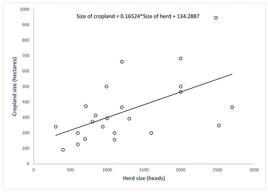 The acres of cropland for farms with nonzero acreage range from 36.83 to 382.83 hectares with a mean of 139. The number of cows in those farms range from 300 to 2700 with a mean of 1264 cows. Figure 5 presents a linear regression with the number of cows on a farm as an independent variable and the total acreage as a dependent variable. It shows that the crop acreage of a (non-zero acreage) dairy farm depends on the number of cows on that farm. For every additional cow, the average cropland size increases by 0.067 hectares. Moreover, even when we assume the crop with the highest N utilization potential (corn) to be grown in the additional 0.067 hectares for each cow, the N surplus increases by 64 kg/yr. This demonstrates a trend of intensification, as the increase in cropland size is not sufficient to assimilate the increased N loading from the increase in the number of cows.