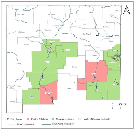 Figure 6 displays the results of the N-balance assessment at the county level (see Table A2 in the Appendix A for detailed N balances). Chaves and Doña Ana are the only two counties with an N surplus: Chaves had a net positive N-balance of over 4 million kilograms, whereas Doña Ana had a surplus of nearly 400,000 kg. Sierra and Socorro Counties have marginally negative N-balances of below 150 thousand kilograms. Despite being two of the largest milk-producing counties in the state, both Curry County and Roosevelt County had the largest negative N-balances of above 10 million kilograms, due to large acreages of field crops in each county. Similarly, Quay County with a negative balance of over 8 million kilograms of N can be a big player in the intercounty among-farm integration of crop and livestock production systems, in the presence of a feasible manure hauling regime.