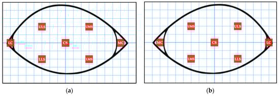 The infrared images were analysed using the FLIR ResearchIR Max software (FLIR Systems Inc., Danderyd, Sweden). The 1234 palette was used for each image as it provided good contrast, allowing the eye to be viewed clearly. The Measurement Cursor Region of Interest (ROI) was used to read the average temperature of a 3 × 3 box of pixels. This ROI was chosen to provide a more accurate indication of temperature as it reads the average of 9 pixels, rather than the Spot Cursor ROI which reads the value of a single pixel. Measurements were undertaken for seven different locations on each eye, including the medial canthus (specifically the lacrimal caruncle) (MC), lateral canthus (LC), upper surface of the eye closest to the MC (UMS), upper surface of the eye closest to the LC (ULS), lower surface of the eye closest to the MC (LMS), lower surface of the eye closest to the LC (LLS) and the centre surface of the eye (CS) (Figure 1 and Figure 2). Where possible, all seven ROI averages were recorded. However, some ROI averages were missing due to obstructions, such as kennel bars, or the angle of the dog’s head within the image (Table 2). If multiple ROI averages were not apparent on a given image, the image could be discarded. Furthermore, blurry images were not used as accurate temperature measurements would not be obtained.