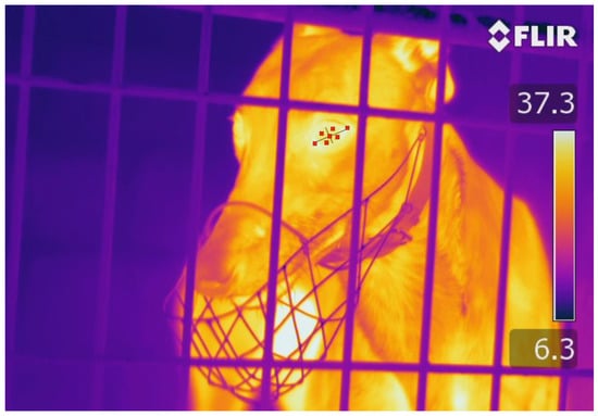 Infrared thermography (IRT) has emerged as a non-invasive and reliable method to infer states of physiological stress in working [9,10], companion [11,12] and production animals [13,14]. It detects infrared radiation that is emitted from an object as a measure of its surface temperature (ST) and presents this as a heat map [11]. Recent studies have used IRT to measure the temperature of the eye, which may reflect how body temperature changes in response to events and stimuli [10,11,15,16,17,18]. Many IRT studies have shown that eye temperature (ET) has the highest correlation with core body temperature (CBT) when compared to the ST of other anatomical regions [10,11,16,17,18,19]. This correlation is attributed to the proximity of the orbit to the brain, as well as the rich blood supply it receives.