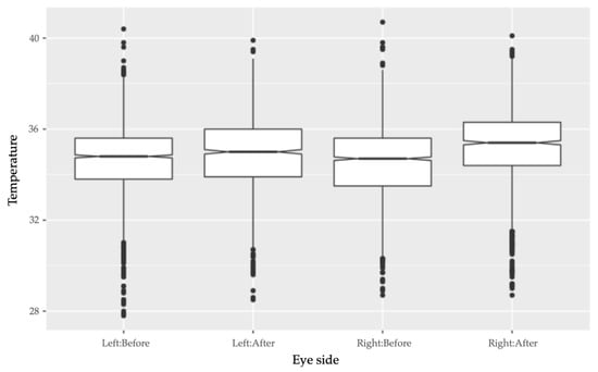 Boxplot showing how temperatures of both the right and left eyes increased after racing. Compared to the left eye, the right eye had a higher increase in temperature after the race.