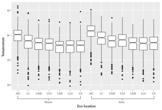 Boxplot of temperature change at the seven locations across the eye after racing. Both before and after racing the medial canthus had the highest temperature, followed by the lateral canthus.