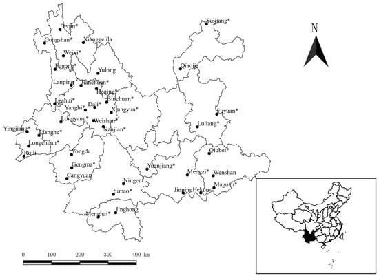 The 39 investigated counties and 27 counties with tropical rat mites (Ornithonyssus bacoti) collected (marked with “*”) in Yunnan Province, Southwest China (1990–2015).