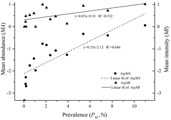 The linear regression between PM, MA and MI of 15 host species with O. bacoti mites in Yunnan Province, Southwest China (1990–2015).