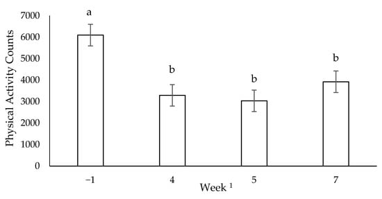 Mean voluntary activity counts during rest days for all dogs (n = 12) throughout 10 weeks of incremental conditioning; ab columns with different letters are different (p < 0.05); error bars represent standard error of the mean; 1 distances run were 3 km (week −1), 30.1 km (week 4), 35.8 km (week 5) and 36 km (week 7).