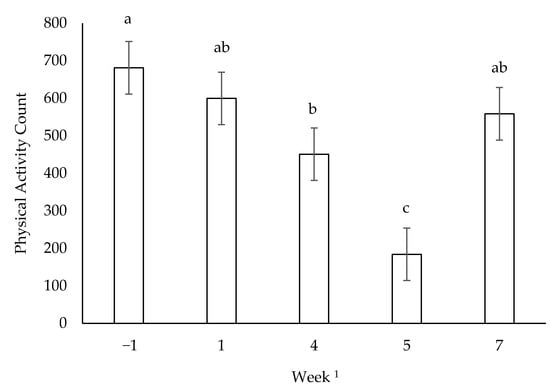 Mean voluntary physical activity counts on run days for all dogs undergoing 10 weeks of incremental conditioning; abc columns with different letters are different (p < 0.05); error bars represent standard error of the mean; n = 14 for weeks −1 and 1; n = 12 for weeks 4, 5 and 7; 1 distances run were 3 km (week −1), 11.2 km (week 1), 30.1 km (week 4), 35.8 km (week 5) and 36 km (week 7).