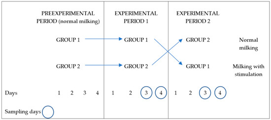 Pre-experimental sampling was carried out beforehand to know the pre-experimental conditions and select the goats enrolled in each of the three experiments. The variables recorded were milking duration, machine milk, hand stripping milk, residual milk, maximum and average milk emission flow, and udder health status (see Section 2.3). The goats selected had a milk yield of over 1 kg at the onset and mid-lactation or 0.5 kg at the end of lactation, respectively, with milking time lower than 6 min, and without clinical mastitis. Milk yield and milking duration (mean ± sd) of the goats selected for each experiment were, respectively, 3.06 ± 0.77 kg and 246 ± 85 s at the onset of lactation, 2.19 ± 0.51 kg and 221 ± 57 s at mid-lactation, and, finally, 1.26 ± 0.31 kg and 151 ± 45 s at the end of lactation. Selected animals were split into two groups with similar characteristics in terms of parity, machine milk yield, milking time, and udder health status (same number of subclinical mastitis animals in every group). Before each experiment, in order to acclimate the animals to the new group and pen, both groups were milked with normal milking during a four-day acclimation period. Later, during the experimental period, each group was milked with a treatment (normal milking or milking with automatic prestimulation) for four days: the first two days to accustom the animals to the treatment (adaptation period), a third day to record milking efficiency variables (sampling day), and the fourth day to record teat end condition variables (sampling day), whereupon animals were switched to another treatment and the procedure was repeated (Figure 1).